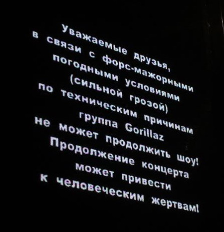 Мы верим, что Вы всецело понимаете, что ничьей вины в том, что группа Gorillaz отыграла неполный концерт, нет. Обстоятельства непреодолимой силы, а именно, шторм во время выступления, явились причиной, по которой единственно правильным решением была приостановка концерта для соблюдения безопасности зрителей, музыкантов и персонала, задействованного в организации. Ваша безопасность всегда остаётся нашим главным приоритетом на всех наших мероприятиях — мы не имеем права рисковать жизнями людей. Мы все очень сильно расстроены, что музыкальный праздник был нарушен и оставляли до последнего момента самую маленькую надежду, что шоу продолжится, однако доводы Артиста и служб, обеспечивающих безопасность на мероприятии, оказались сильнее наших надежд.